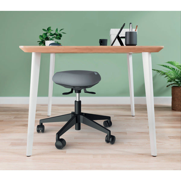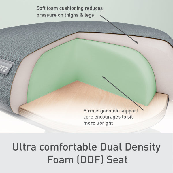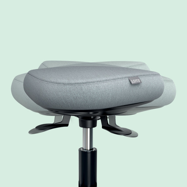 The Leitz Ergo Active Sitting Stool helps to keep you energized, comfortable, and ready to enjoy an active workday with every move you make! It features a triangular seat that contours to your body like a saddle, helping to spread your weight evenly for enhanced comfort. The seat is made with a unique 9cm thick Dual Density Foam (DDF). This means the foam has two layers: a firm inner layer for strong support and a softer outer layer for comfort. This combination helps you maintain good posture and reduces the pressure on your legs, making it easier and more enjoyable to sit for longer periods without discomfort. The smooth tilting of the seat with 360° DSM Dynamic Spine Motion technology (patent pending) allows it to lean in any direction, which promotes natural movement and encouraging you to sit upright and keep moving. This can help to improve core strength and balance, reducing aches and pains. Tested and certified by the German Institute for Health and Ergonomics (IGR), this adjustable height ergonomic wobble stool is crafted to keep you comfortable and active, whether at home or in the office. The fabric seat cover is made from 100% recycled material.