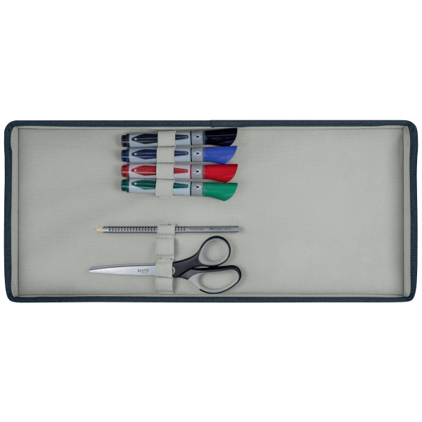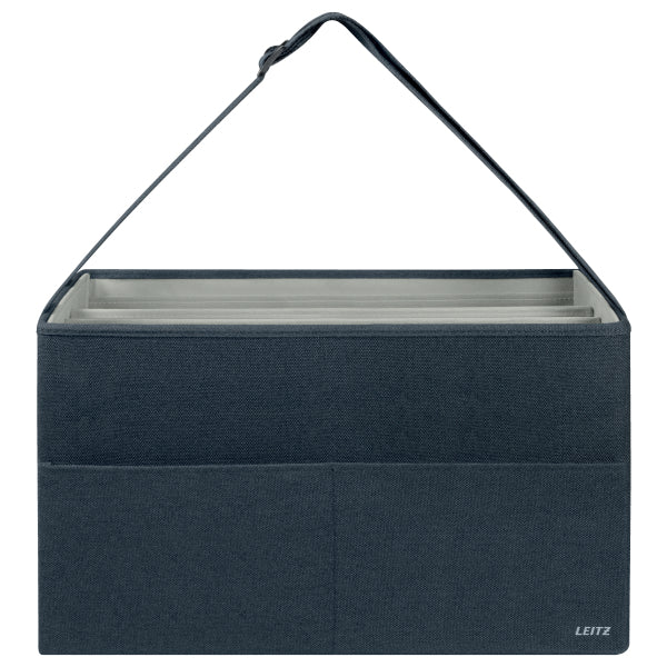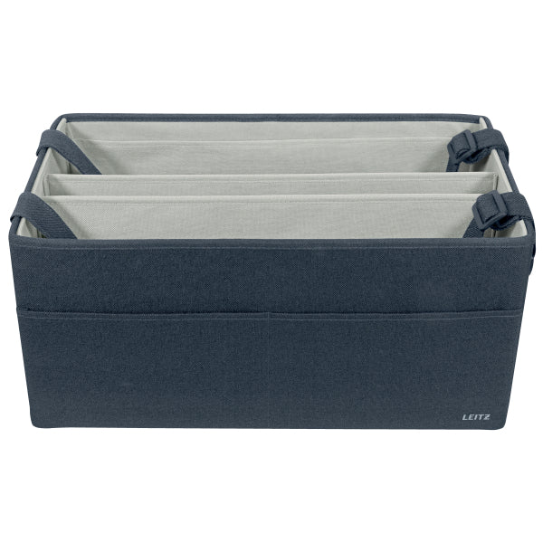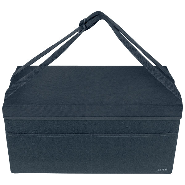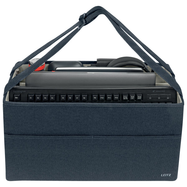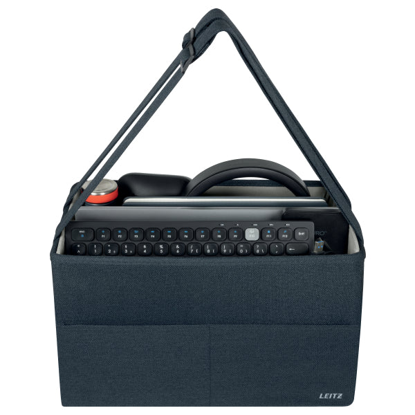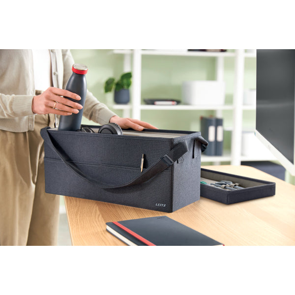 Foldable compact hot desking storage bag ideal for staying organised in the office, at home, working hybrid or at school, also ideal as a teacher's bag. The Leitz Fabric Hot Desking Work Bag with Lid has 3 separate compartments that allow you to store and carry everything you need for the day ahead. This modern and practical storage bag has enough space to hold a laptop up to 16'', a full size keyboard, a mouse, a charging cable, a headset, a notebook, and a water bottle. Equipped with a lid that protects the contents from dust or accidental spills, and helps to keep privacy and confidentiality. Overall 57% recycled material. When not in use, the bag is fully collapsible, so it can be easily stored away. The name tag included with the bag allows you to easily identify it in shared spaces.